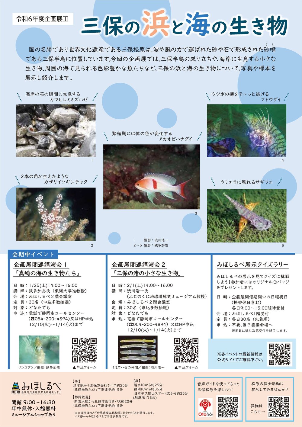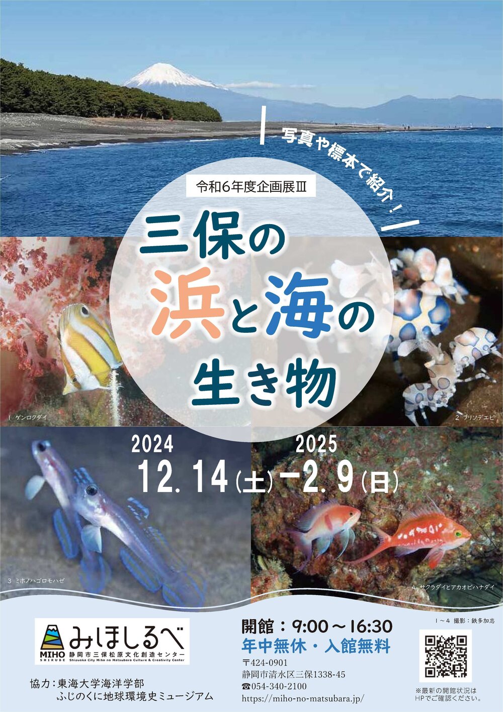 国の名勝であり世界文化遺産である三保松原は、波や風の力で運ばれた砂や石で形成された砂嘴である三保半島に位置しています。今回の企画展では、三保半島の成り立ちや、海岸に生息する小さな生き物、周囲の海で見られる色彩豊かな魚たちなど、三保の浜と海の生き物について、写真や標本を展示し紹介します。