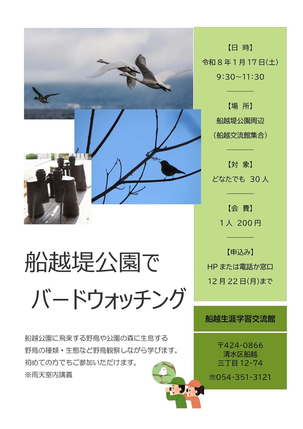 船越堤公園に飛来する野鳥、公園の森に生息する野鳥の種類・生態など野鳥観察をしながら学びます。