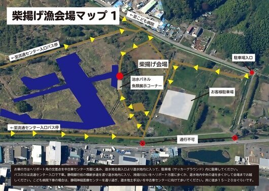 静岡ヘリポートのところの交差点を中古車センター方面に進み、遊水地北側入口より遊水地内に入って、駐車場(サッカーグラウンド内)に駐車してください。
