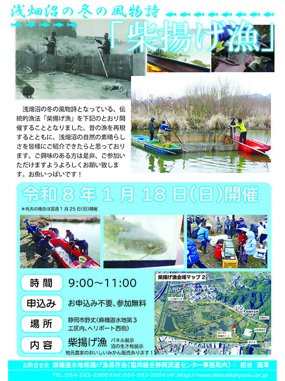浅畑沼の冬の風物詩となっている、伝統的漁法「柴揚げ漁」を下記のとおり開催することとなりました。