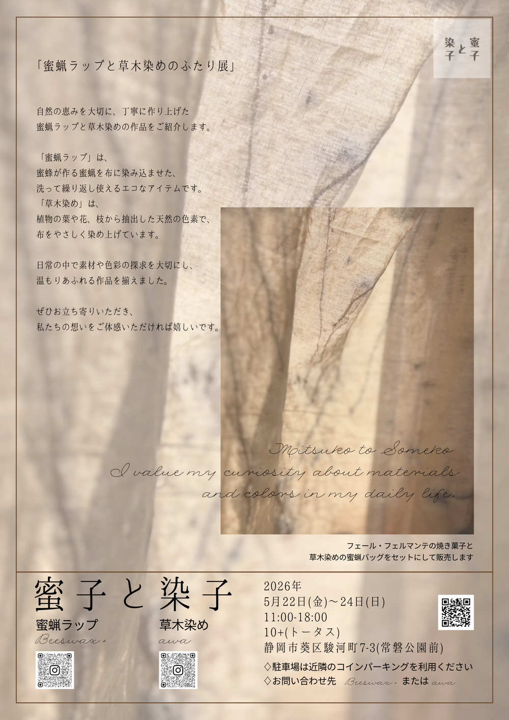 【5月22日(金)~24日(日) 開催】蜜子と染子 ー蜜蠟ラップと草木染めのふたり展ー