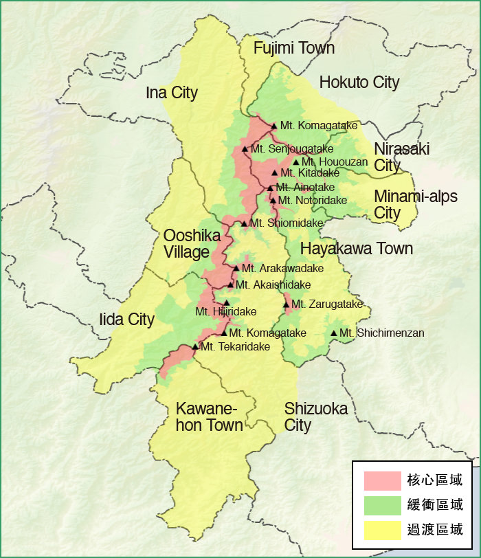 長年受南阿爾卑斯群山阻隔交流的3縣10市町村地區,基於「高山深谷孕育的多樣生物與文化」的共同理念,以南阿爾卑斯山世界生物圈保區相互結合,將南阿爾卑斯山的自然環境和文化作為共有財產,藉由永久保護、永續利用豐富自然環境的共同努力來擴大地區間交流,運用自然恩惠打造魅力富饒的地區。
