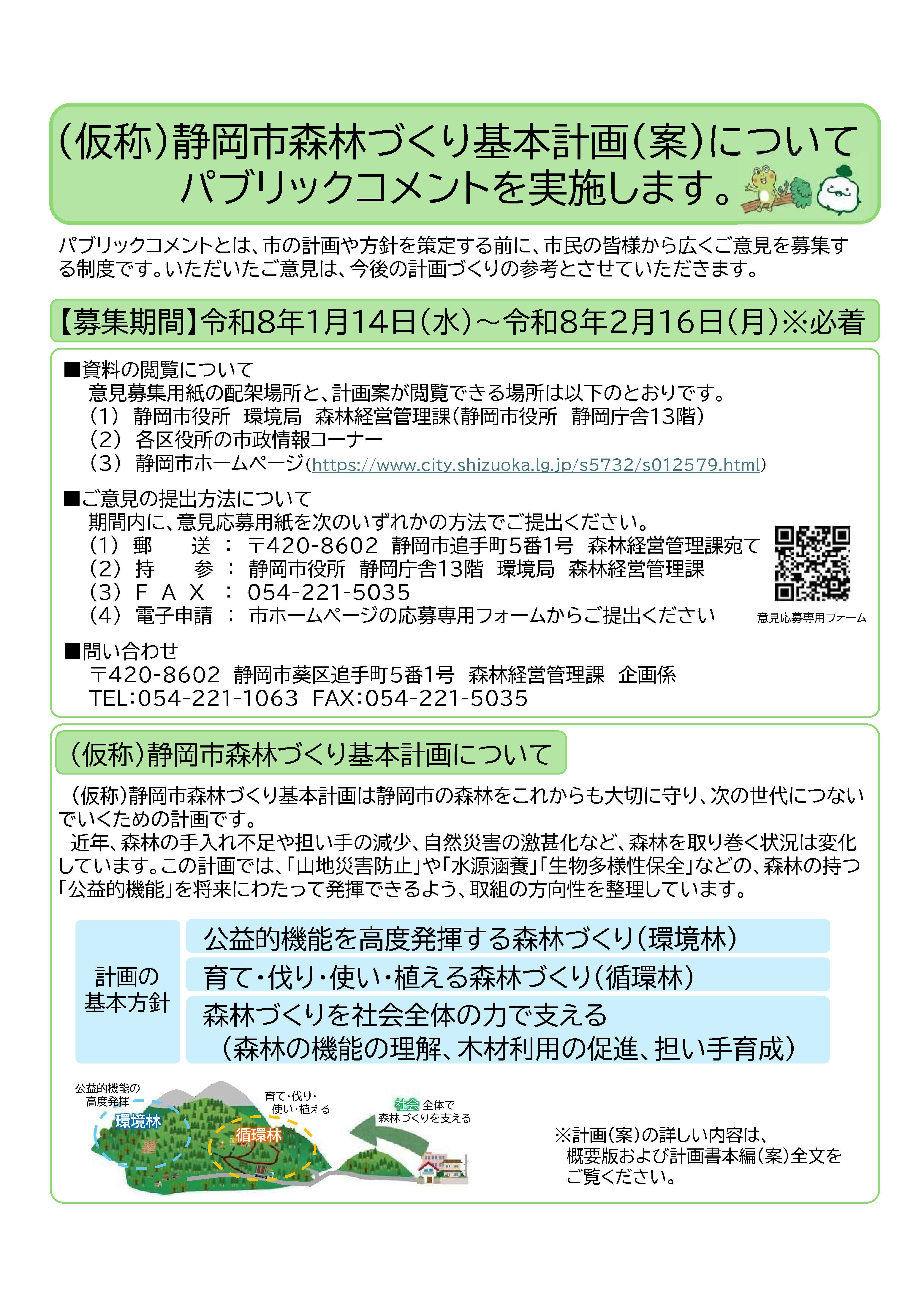 (仮称)静岡市森林づくり基本計画(案)についてパブリックコメントを実施します。