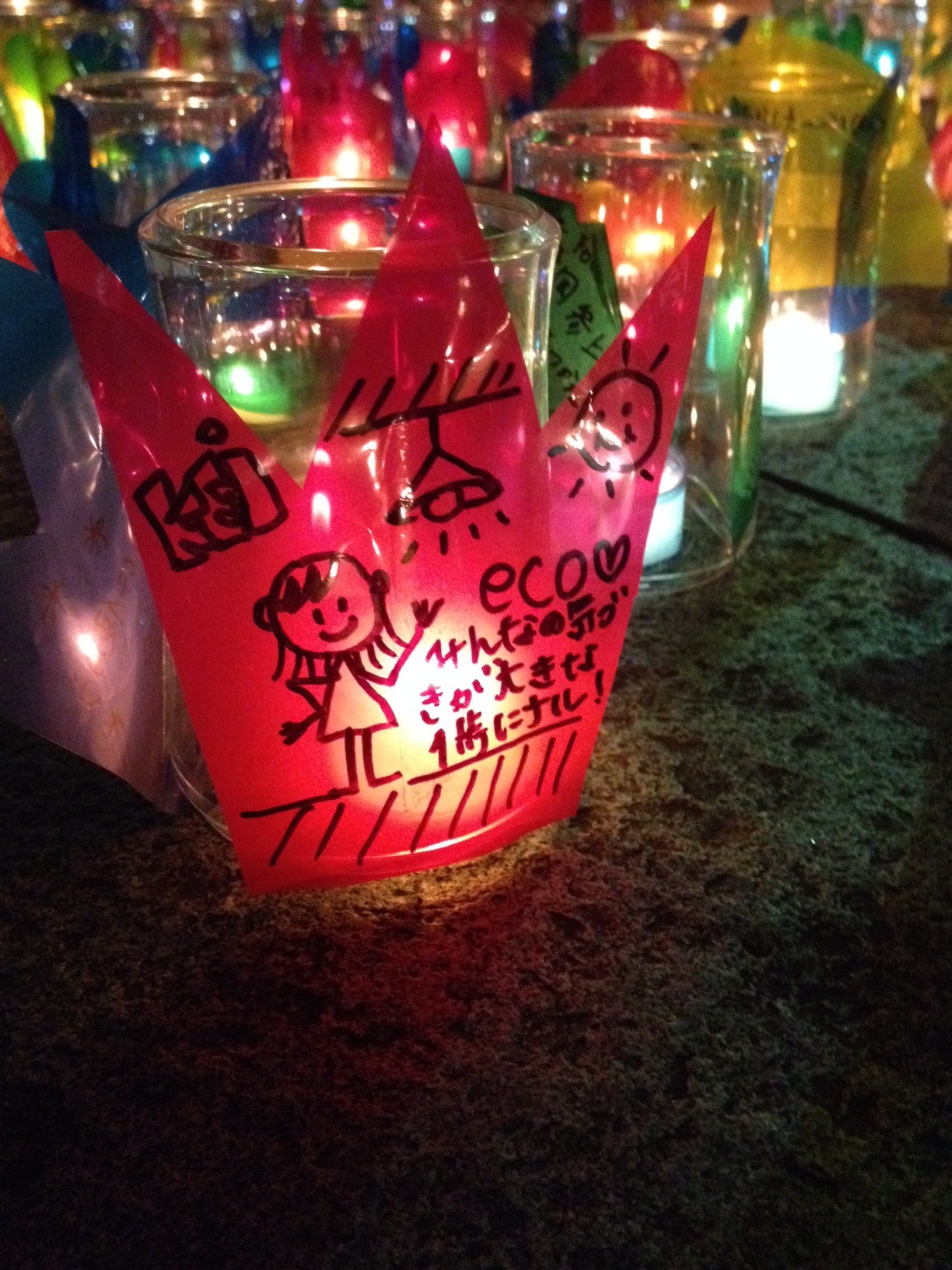 一方、会場内のテントでは、地球温暖化防止に向けた取組を「STOP温暖化メッセージ」として記入していただき、会場内のキャンドルとともに掲出!