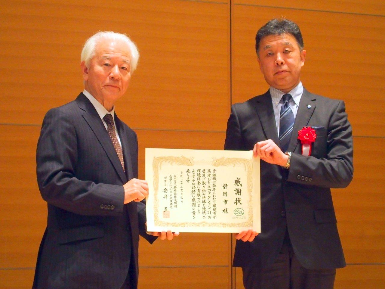 一般財団法人持続性推進機構エコアクション21中央事務局から静岡市に感謝状が贈呈されました!