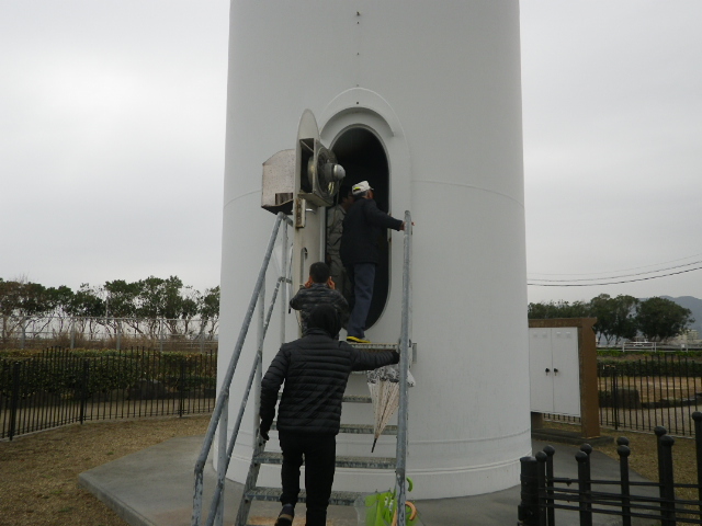 この日は特別に「風電君」のタワー内部も見学していただきました。ナセル内(羽がついている一番上の部分)の機器に故障が生じた場合は、ハシゴを20分かけて登り,修繕作業を実施します。