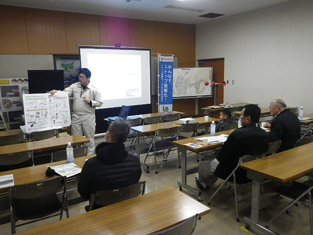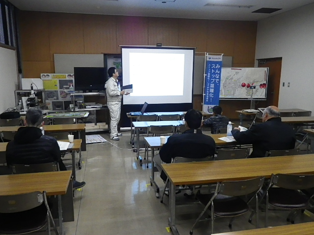 見学会後半は、中島浄化センターの会議室にて、「地球温暖化の影響としくみ」を学んでもらったり、「風電君」が完成するまでのビデオ鑑賞をしていただきました。