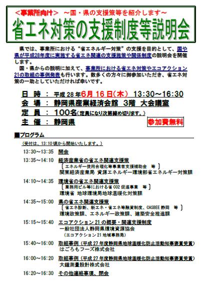 経済産業省、環境省、静岡県が平成28年度に実施する省エネ関連の支援施策や関連制度について詳しい説明を聞くことができます。