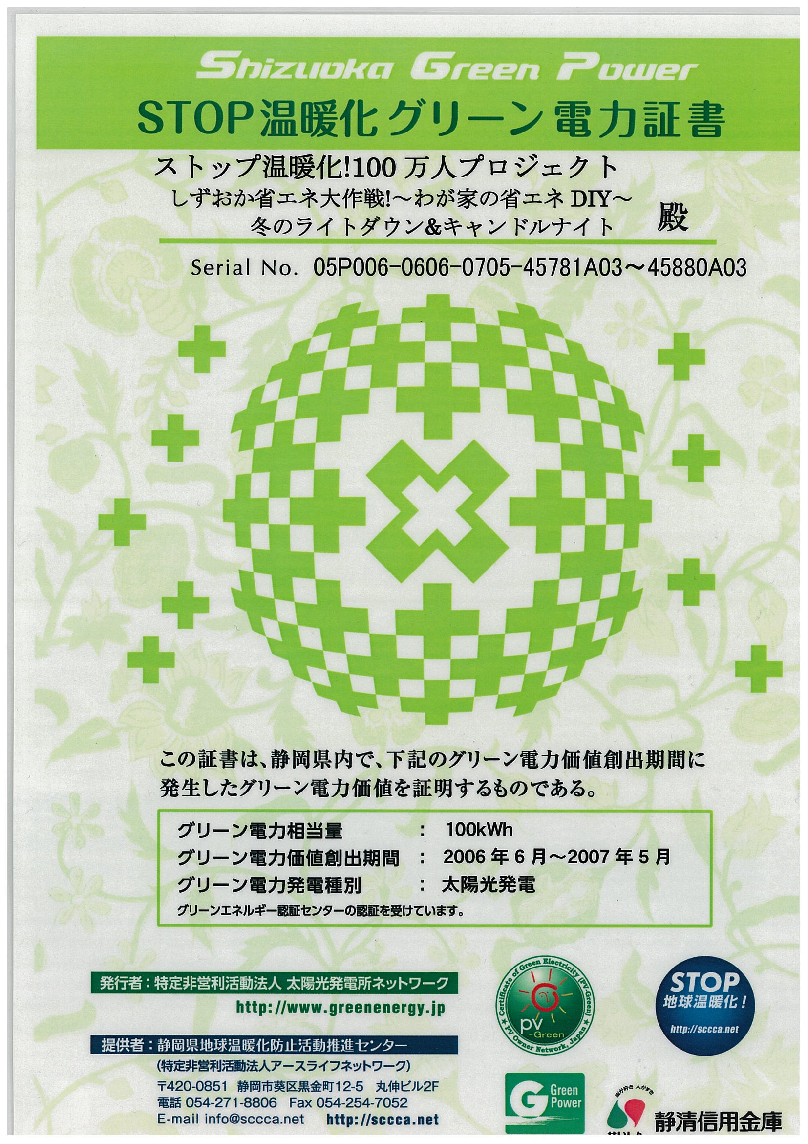 なお、本イベントは静岡県内で太陽光発電されたグリーン電力を使用しているため、静岡県地球温暖化防止活動推進センターより「グリーン電力証書」を贈呈されました。