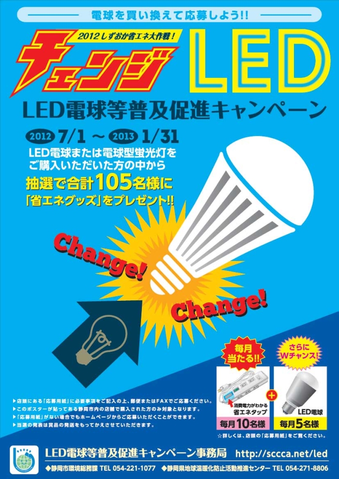 静岡市では、市民総参加で省エネに取り組むため、家庭でできる省エネ効果の高いLED電球及び電球型蛍光灯への買い替えを目的とした普及促進キャンペーンを実施しています。