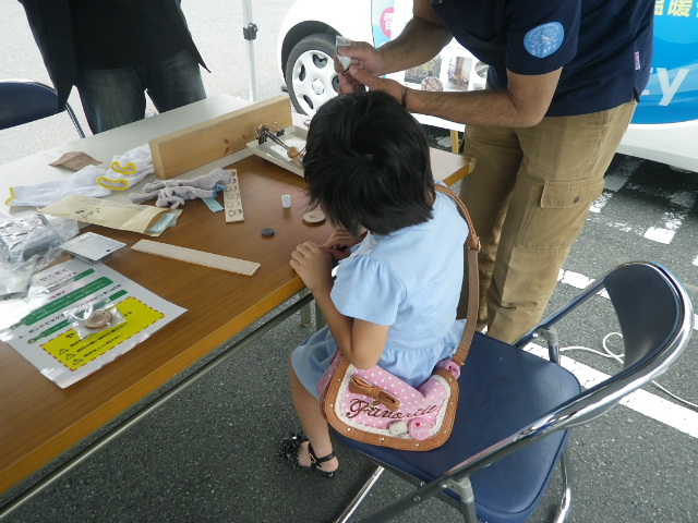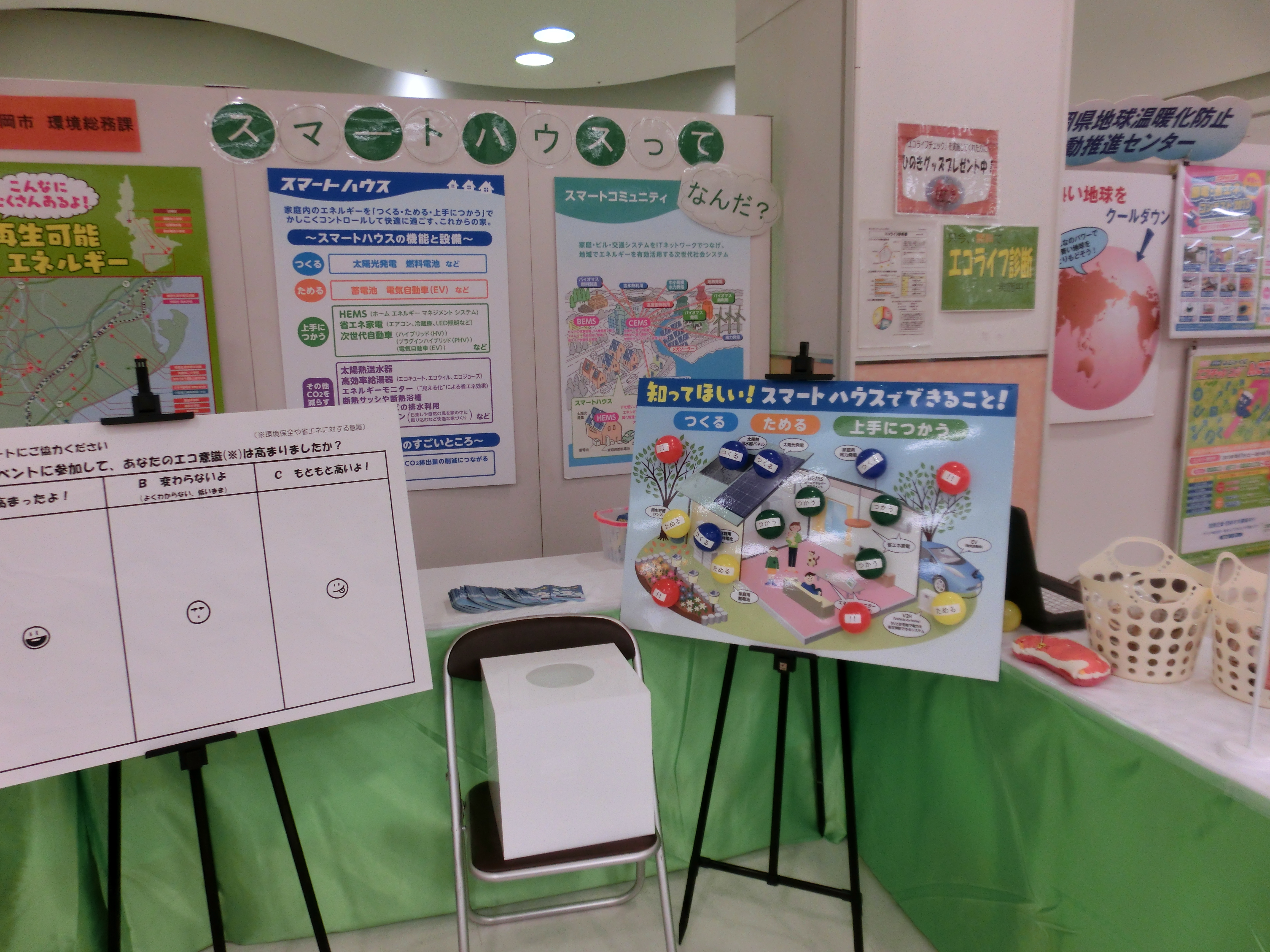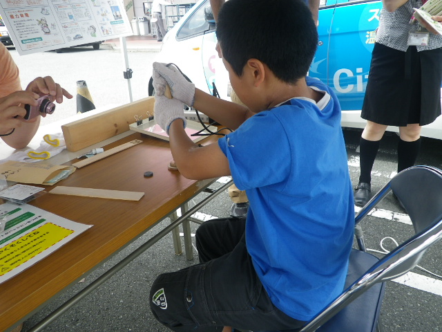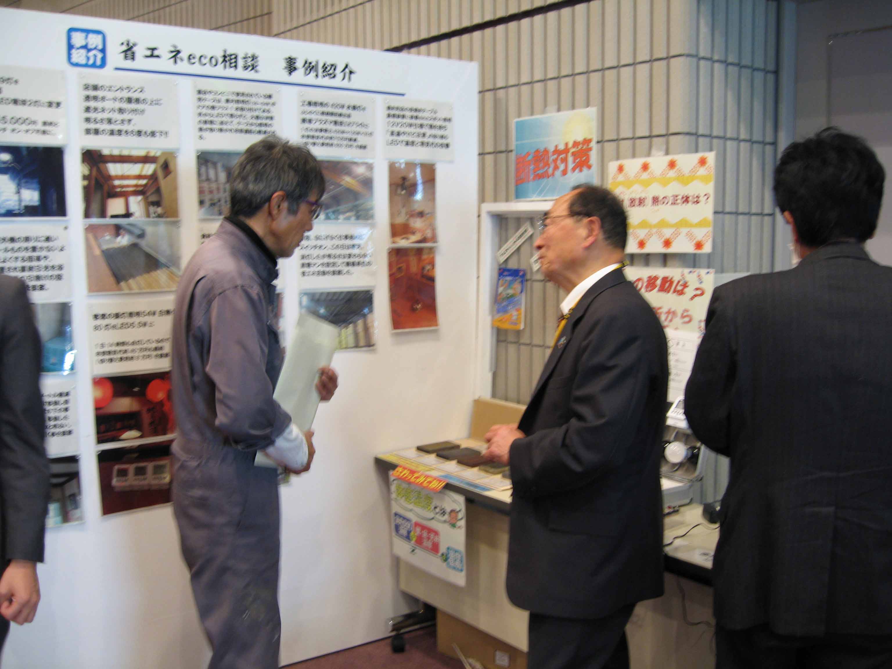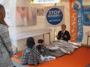 各ブースでは、アルミシートや断熱シートを用いて、これまでよりも一歩進んだ省エネのアドバイスや、LED照明や遮光・遮熱ブラインドの紹介、オリジナルECOカードの作成、そして電気自動車の新しい使い方である電源供給の紹介・実演が行われました。