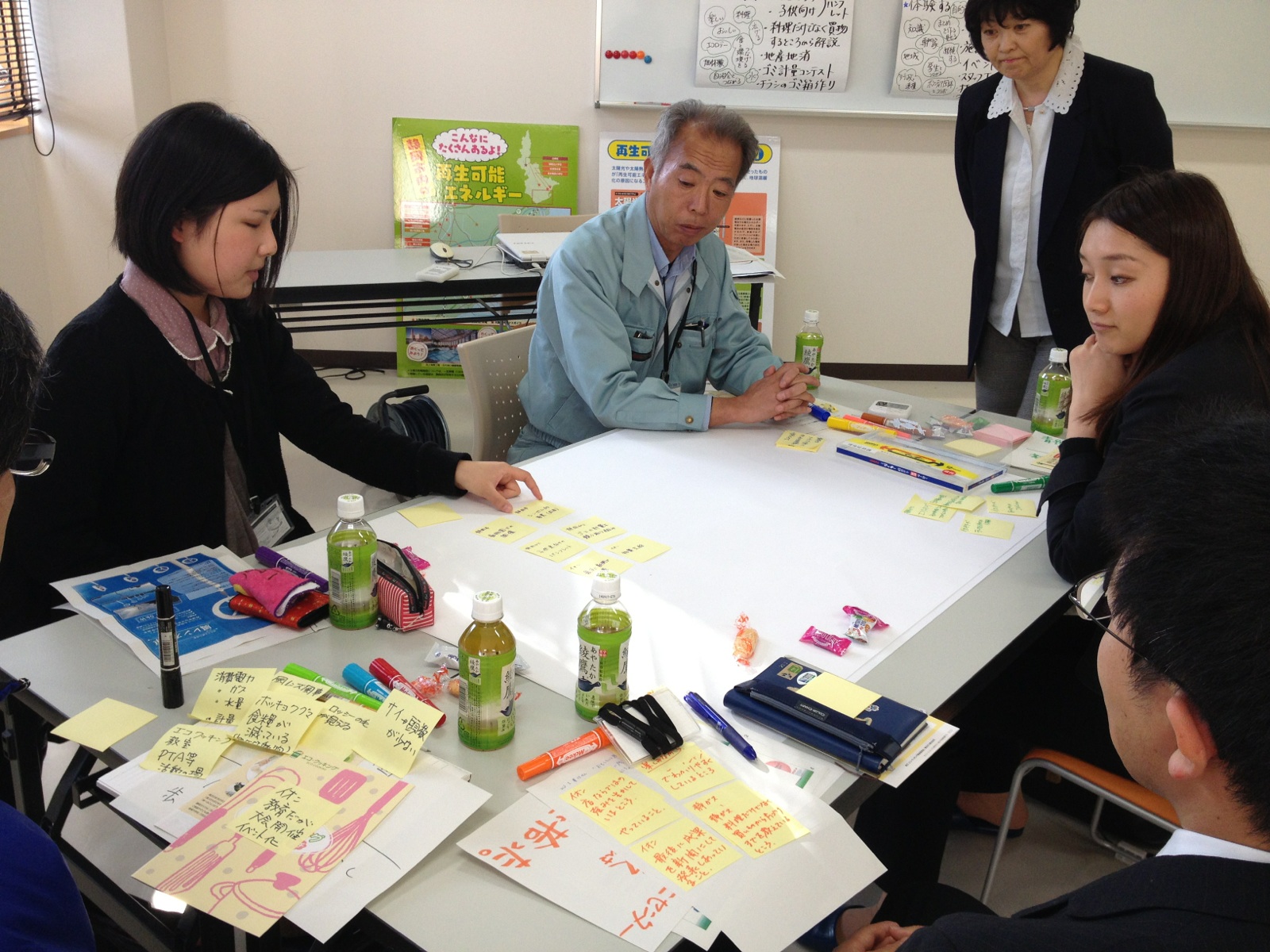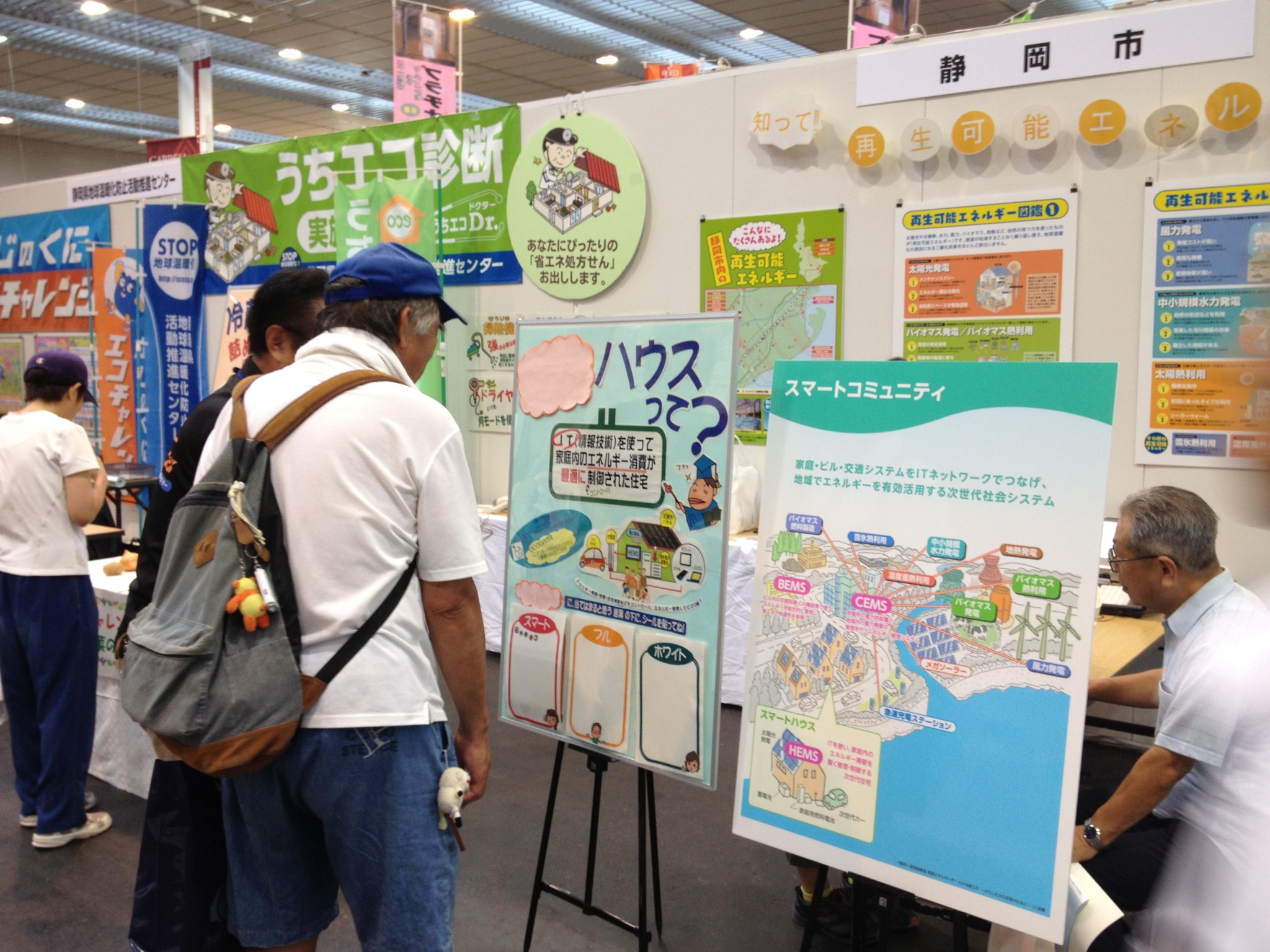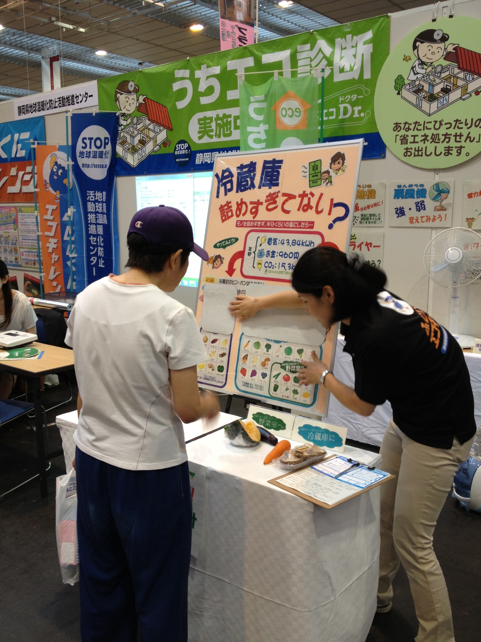 各ブースでは、アルミシートや断熱シートを用いて、これまでよりも一歩進んだ省エネのアドバイスや、LED照明や遮光・遮熱ブラインドの紹介、オリジナルECOカードの作成、そして電気自動車の新しい使い方である電源供給の紹介・実演が行われました。
