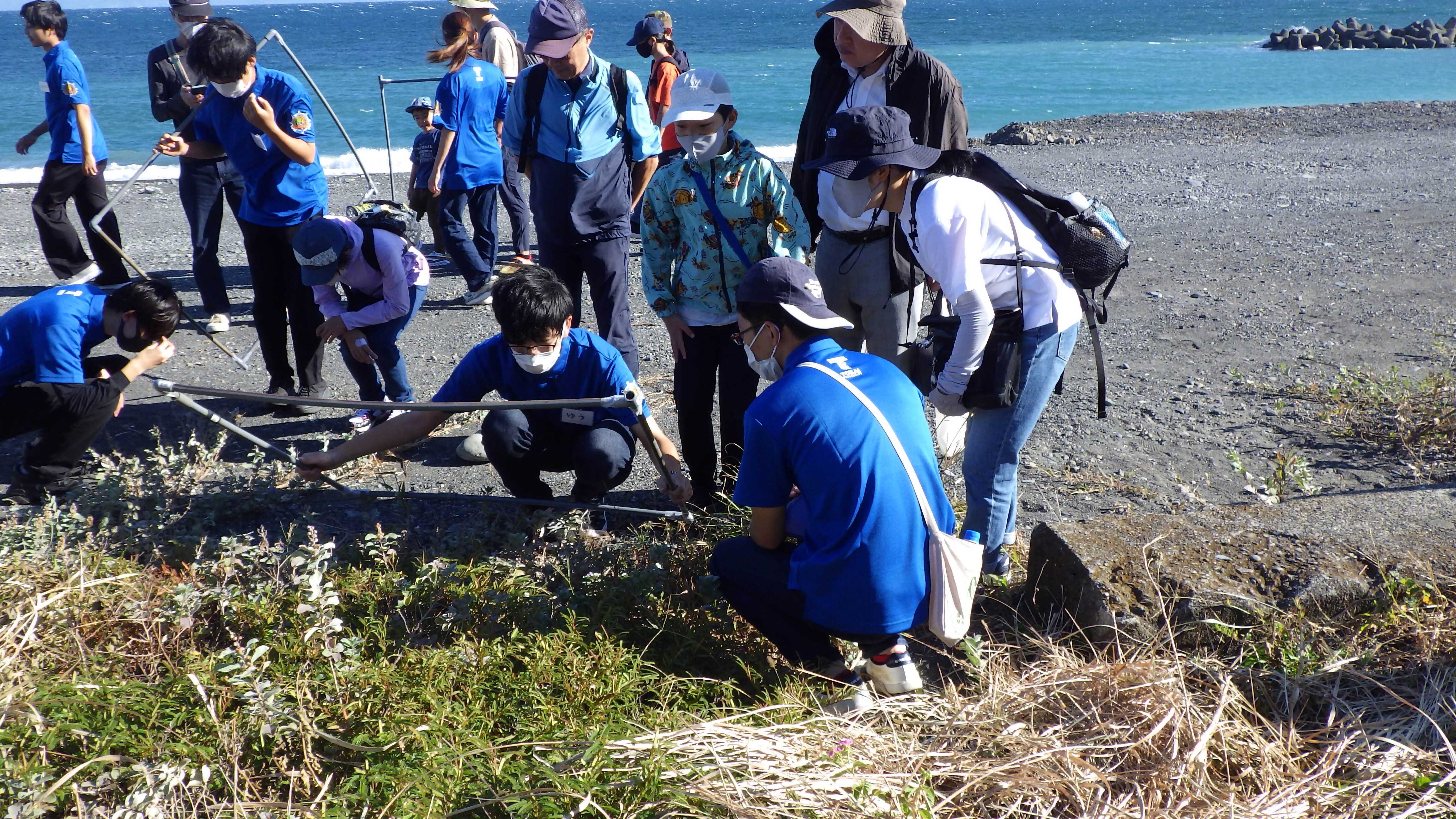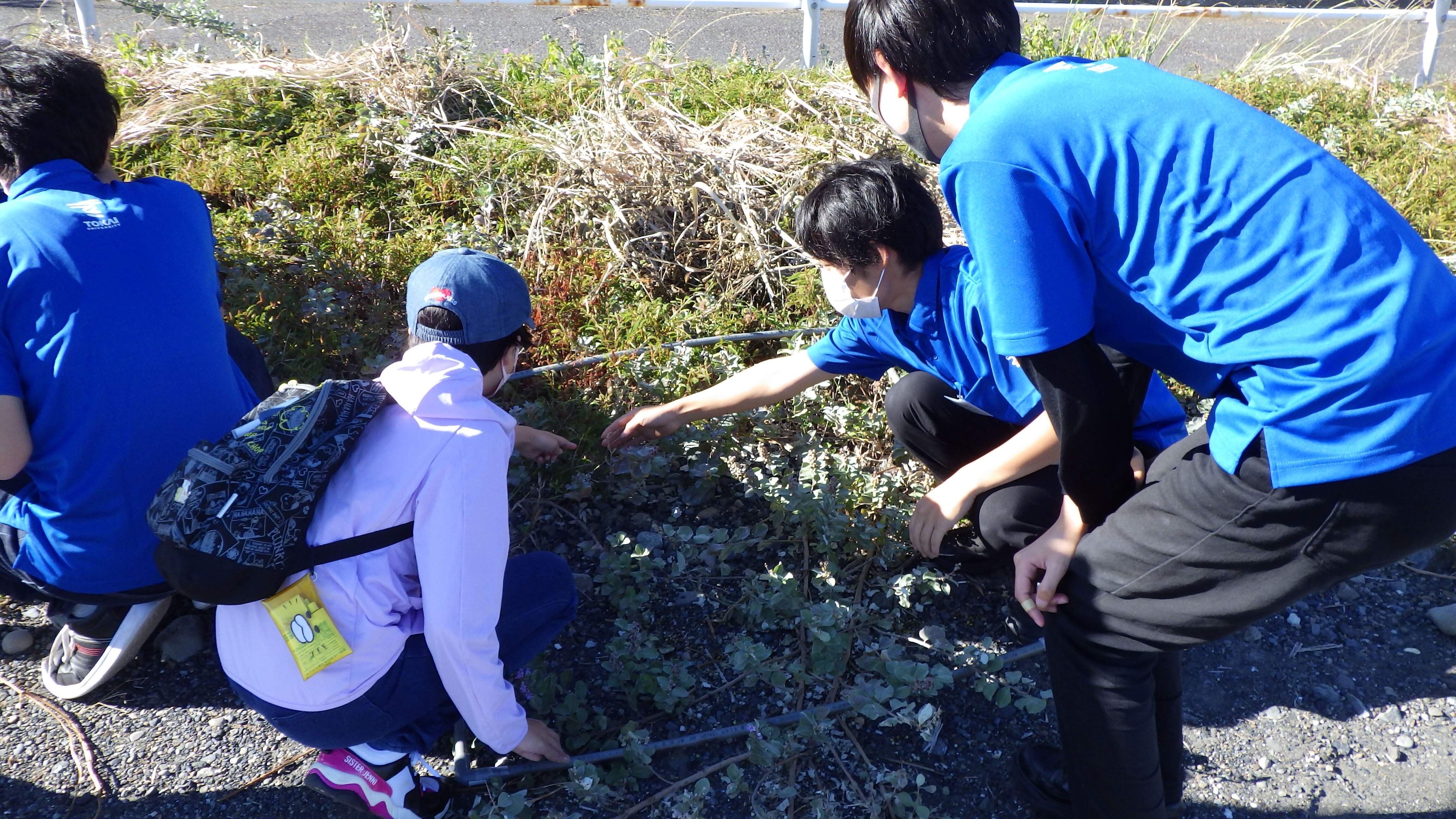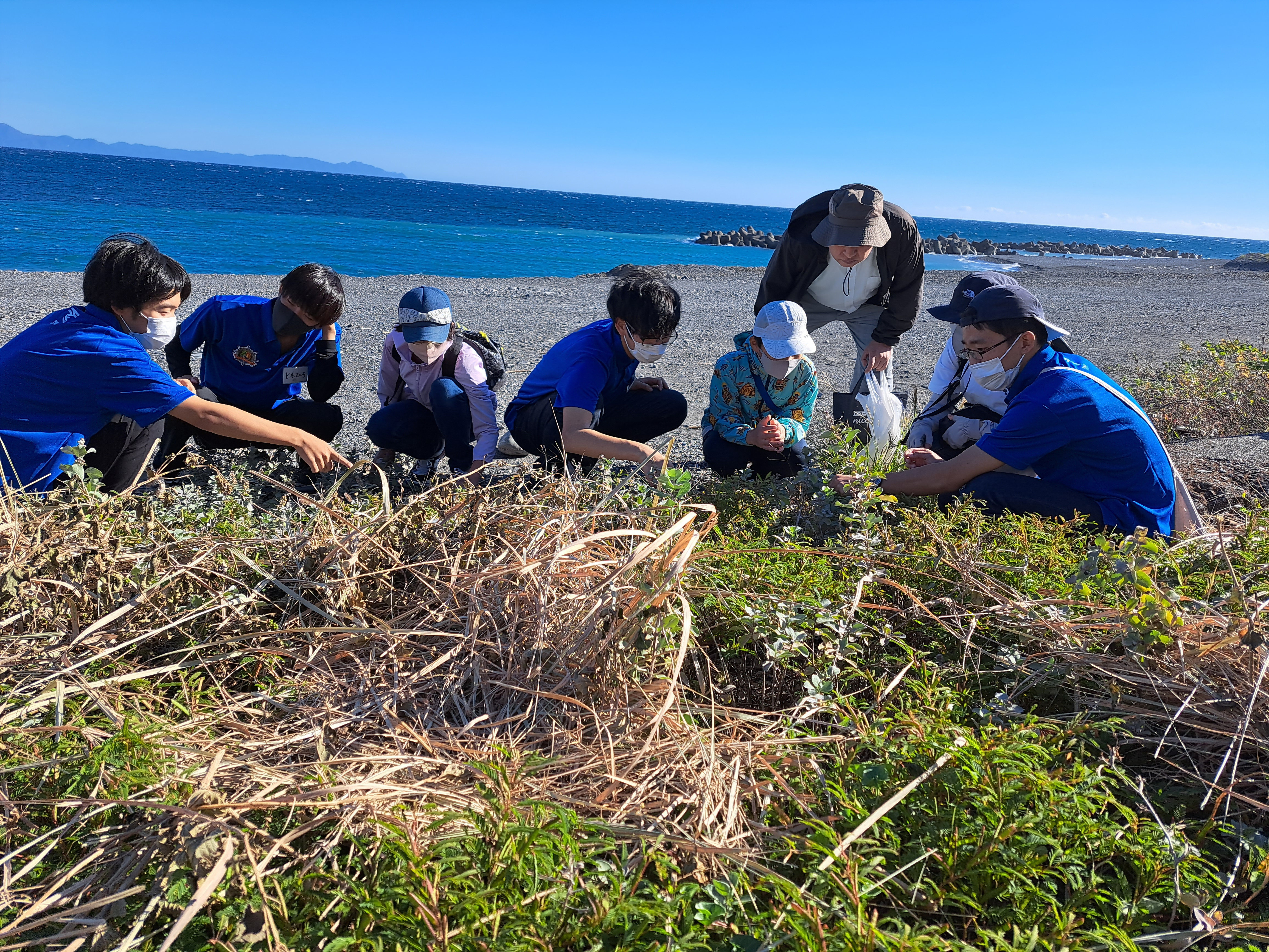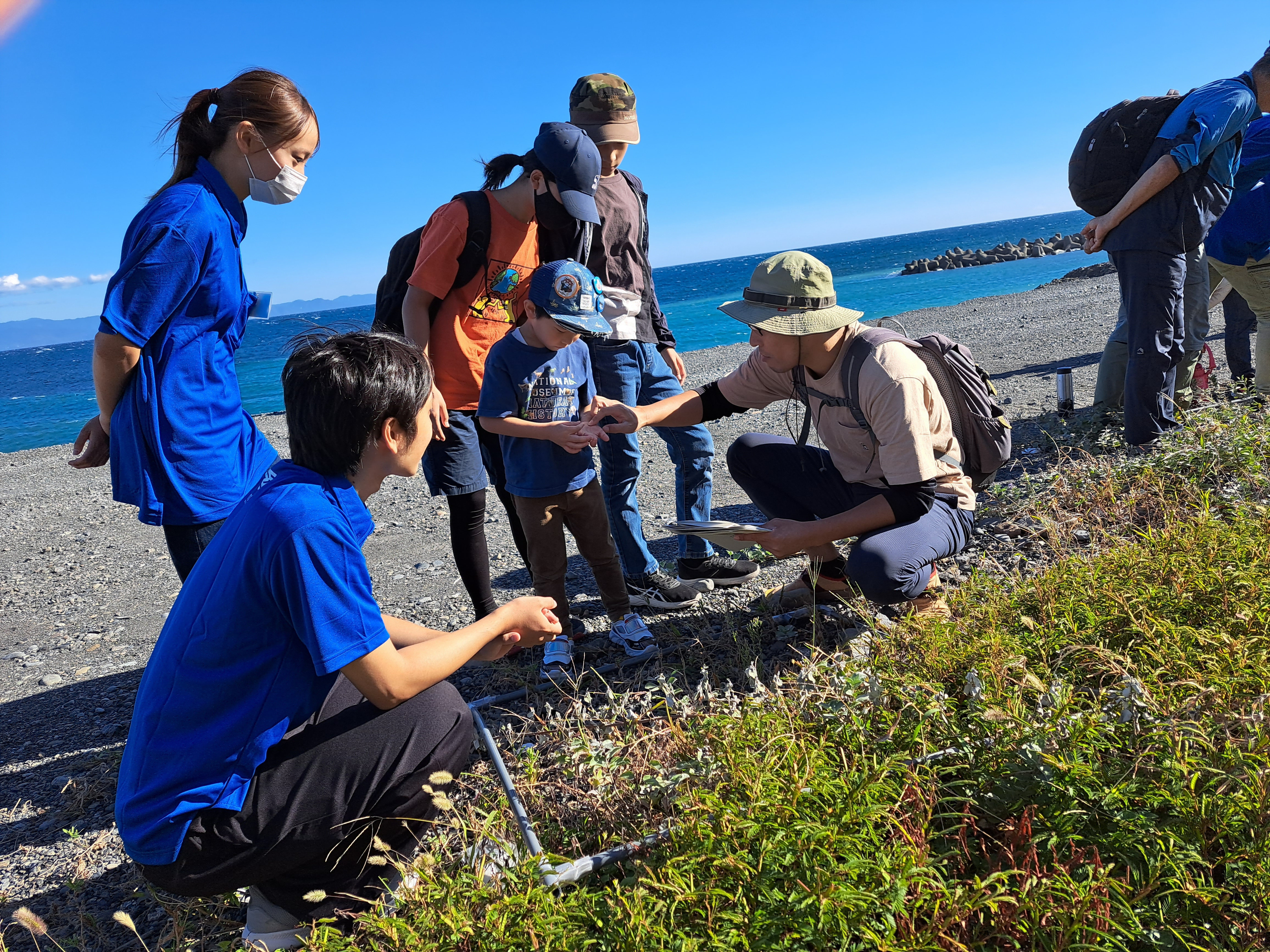 さらに、キャンパスの裏の三保海岸で、実際に海浜植物の観察を行いました。学生のお兄さん、お姉さんがとても丁寧に解説してくれました。