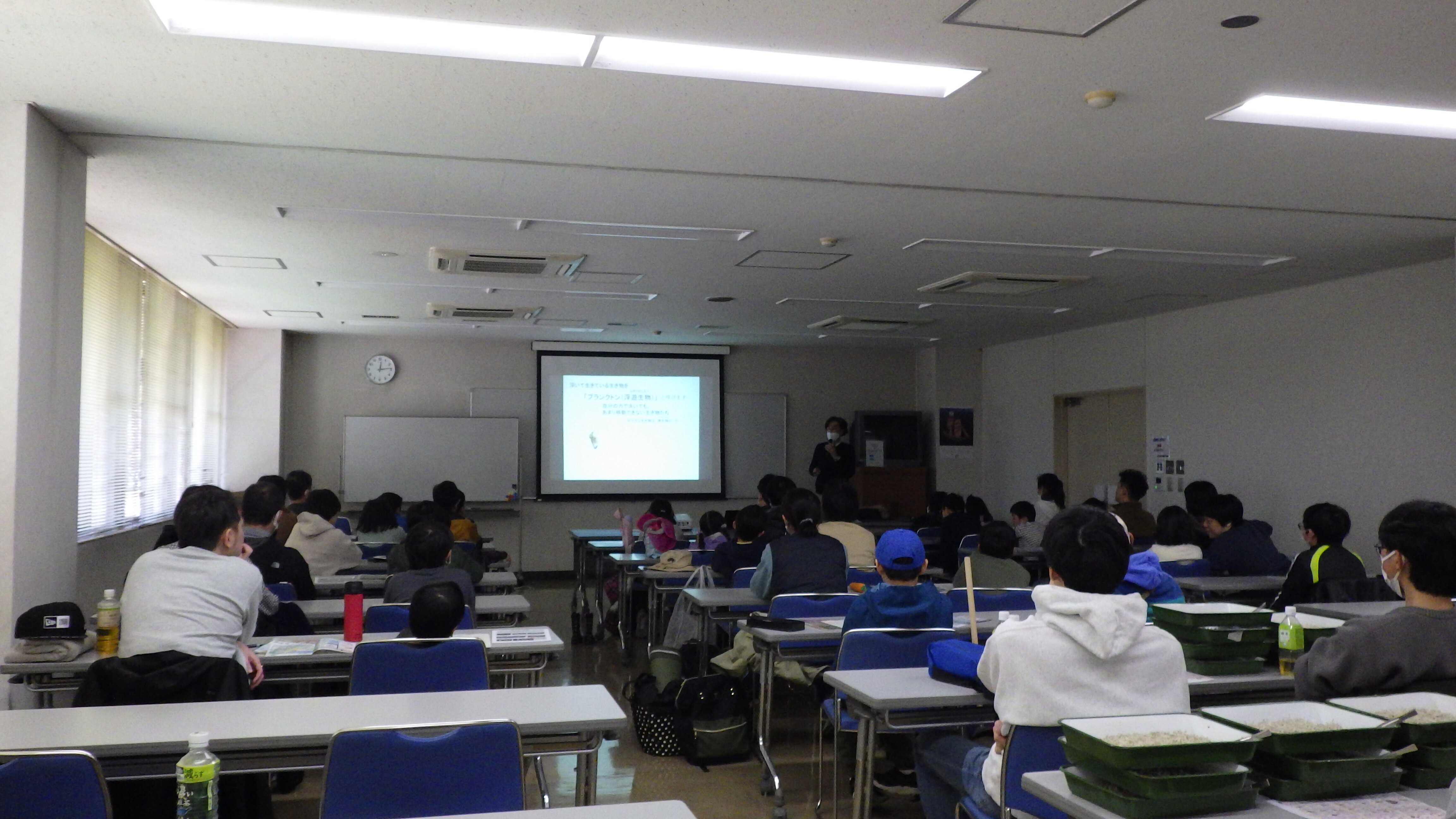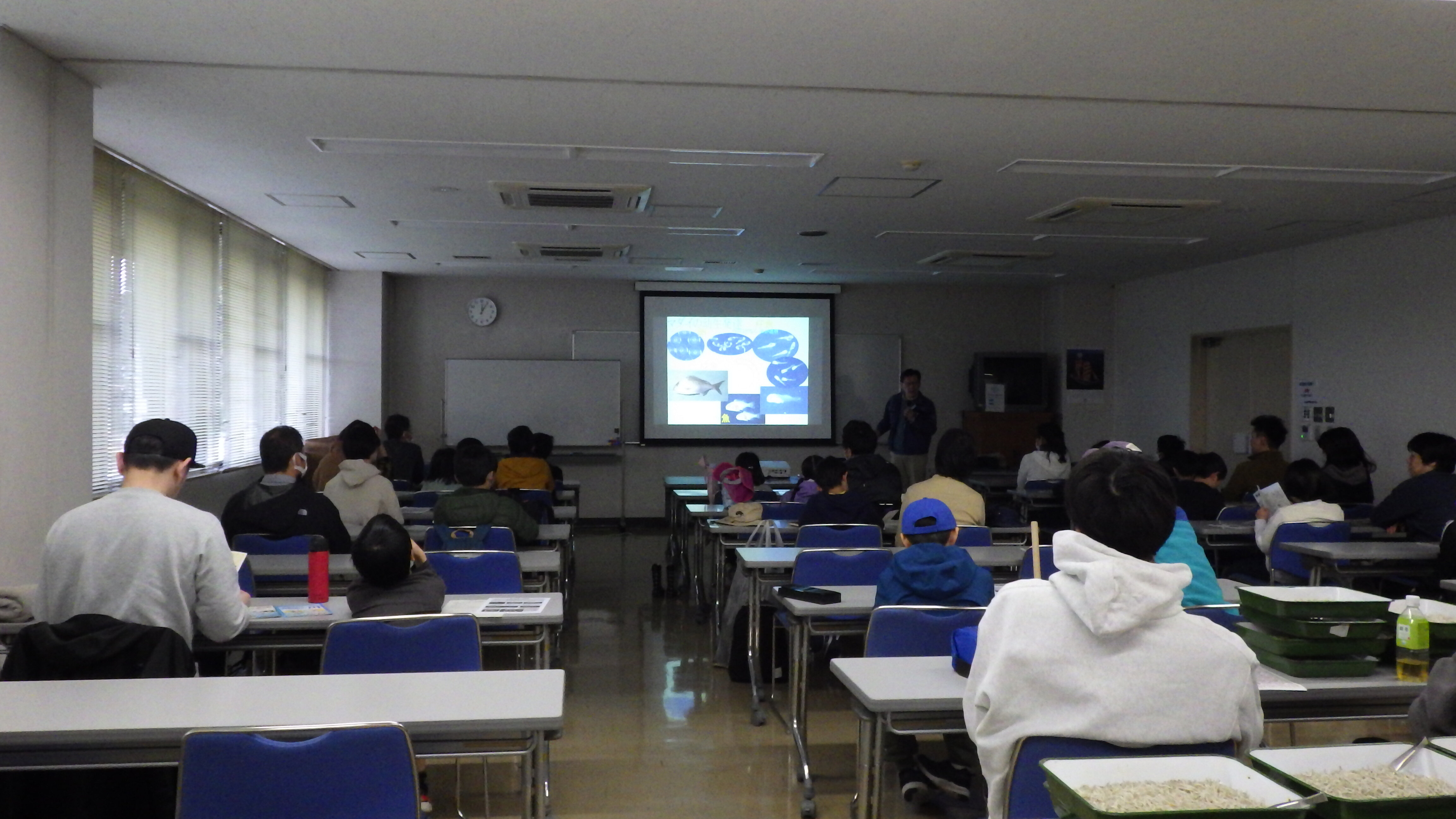 その後、駿河湾(用宗)のチリメンジャコが入ったトレーが配られ、参加者は図鑑を見ながら名前を調べたり、講師や学生から解説を受けました。