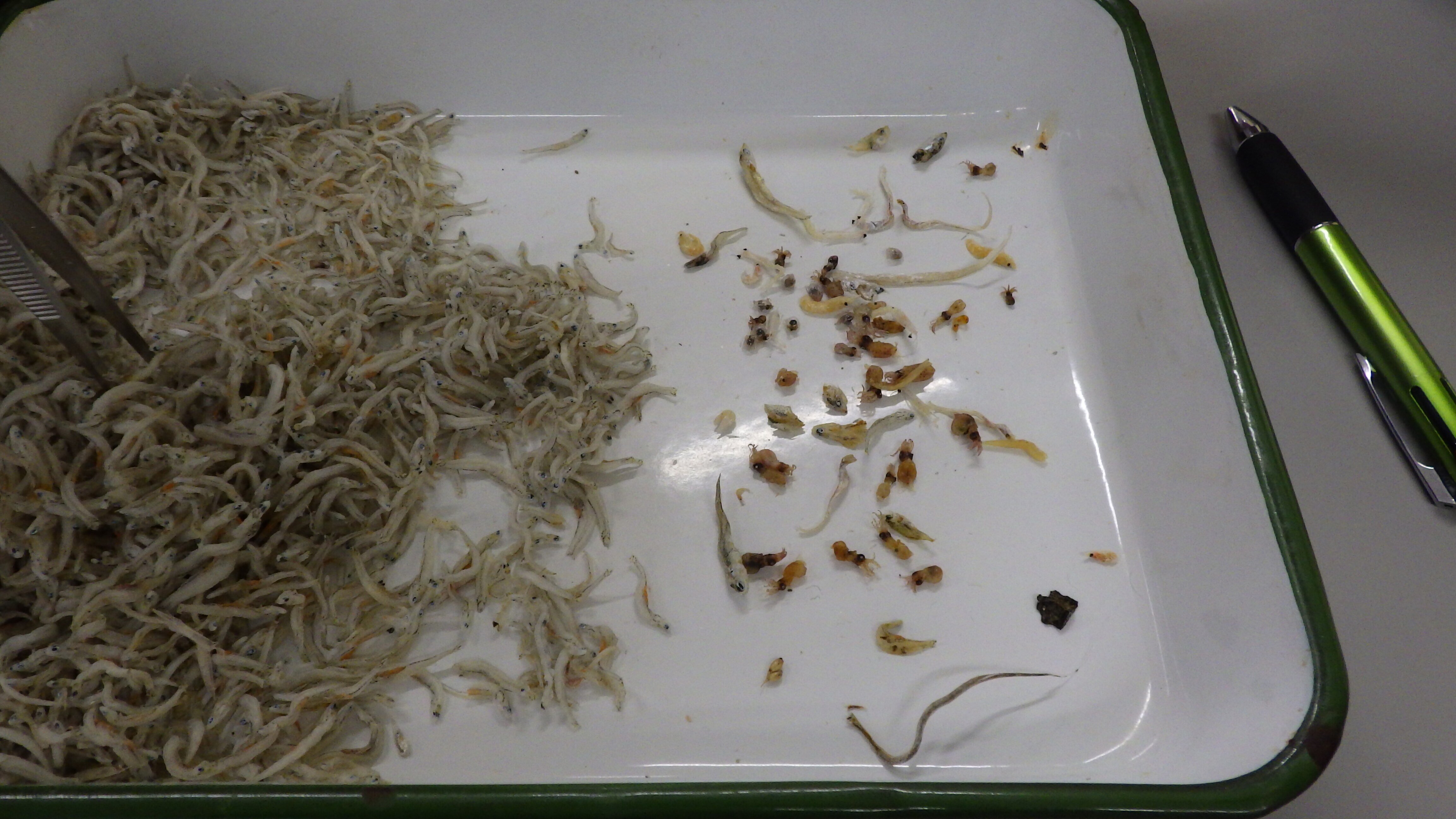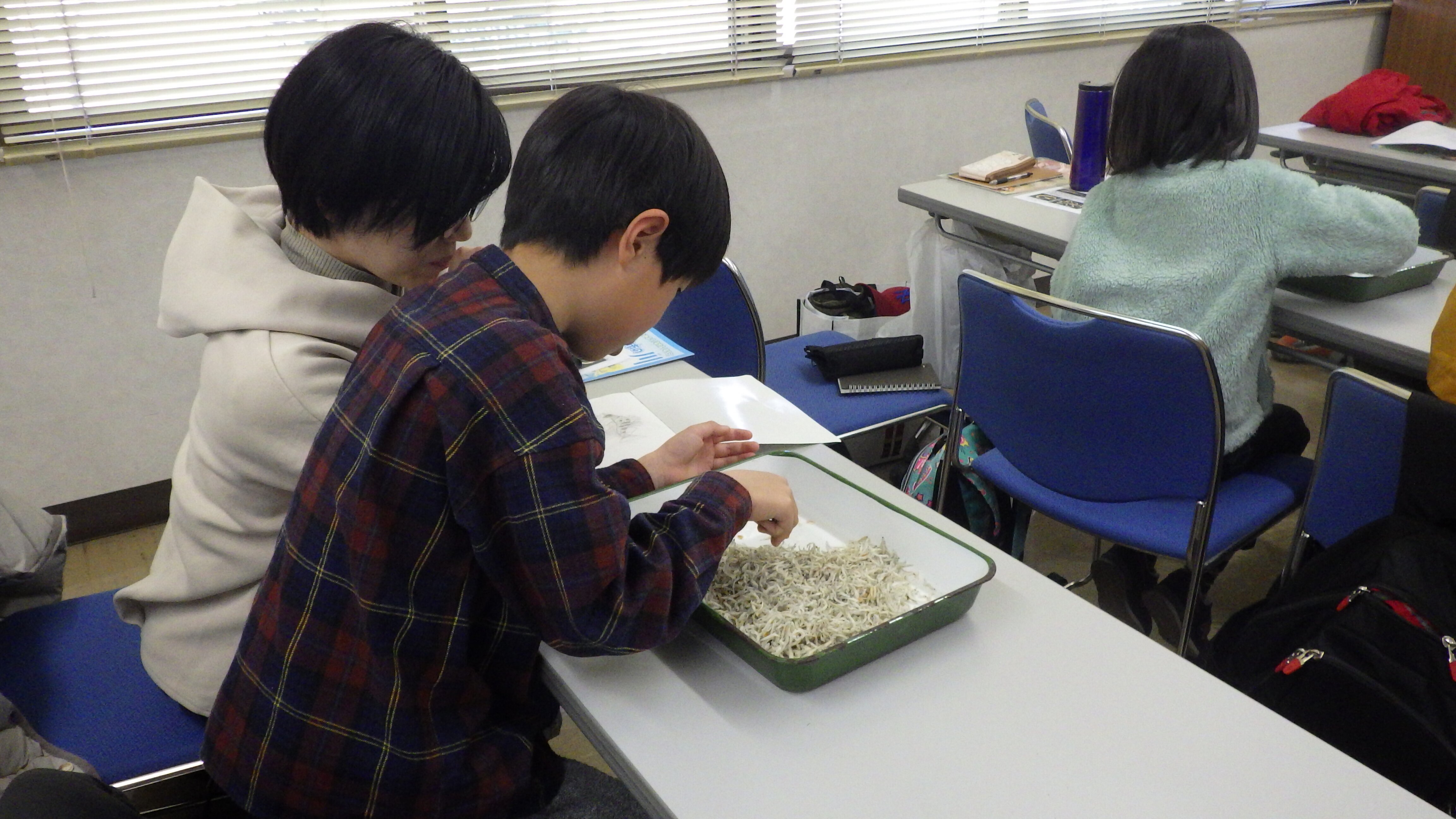チリメンジャコの中に混ざっている仔魚・稚魚について学びました。