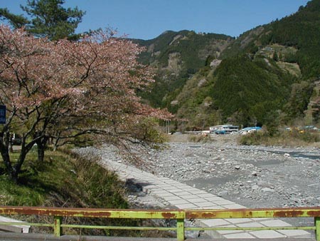 同じ地点の写真です。川は向こう側を流れています。撮影したのは4月ですが、まだ桜の花が咲いています。