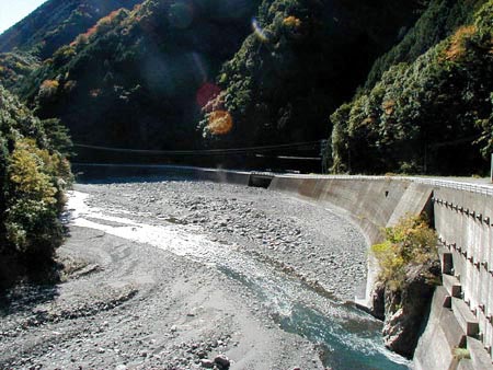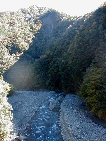 右岸側(写真右側)に護岸された道路が長く続いています。落石や土砂崩れを防ぐものです。このように川の流れが大きく曲がるところでは、増水時に道路を削ってしまうため、このような施設が欠かせません。