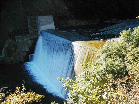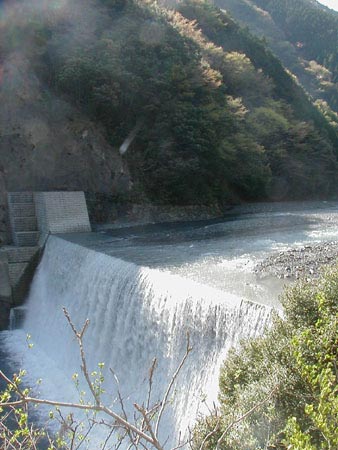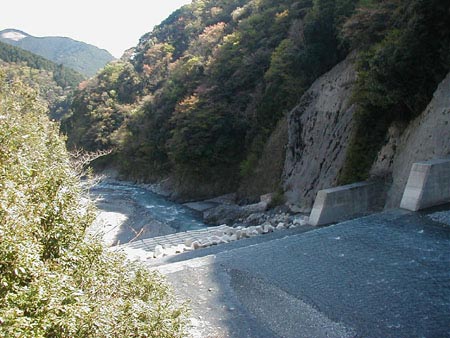 同じ地点の秋の写真です。春に比べて水量が減っています。砂防ダムの左岸側(手前側)には、コケが生えています。