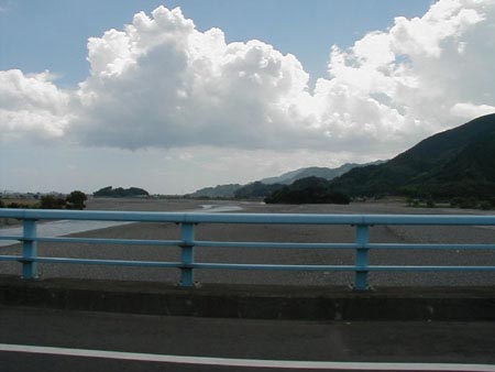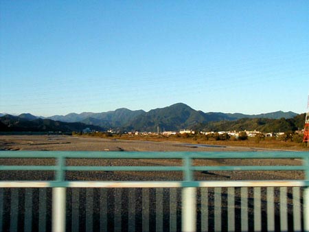 安西橋からの下流方面の風景です。川が流れたあとも見えます。写真奥の左の山が舟山です。舟山からの風景も美しく風情があります。舟山付近で右岸側(右側)から藁科川が合流してきます。