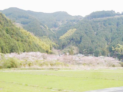 山の緑と桜並木がとてもきれいです。桜が咲くことで風景がパッと明るくなります。手前に見える田んぼは、秋になったら桜に変わって、一面稲穂が黄金色に実り、この景色を彩ります。