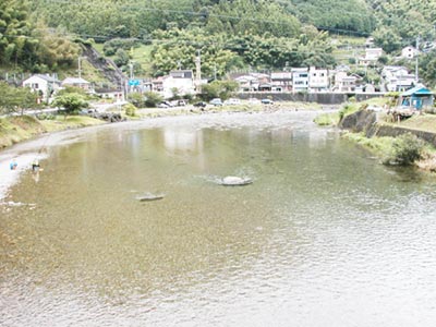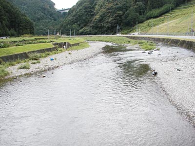川の流れがほとんどない場所です。この流れに合った静かな町の景色が広がっています。美しい興津川を日常に感じることができる、素晴らしい環境です。