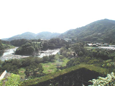 吊り橋からのながめです。吊り橋はゆれるから、注意してわたろうね!立花の河岸段丘(かがんだんきゅう)が見えますか?