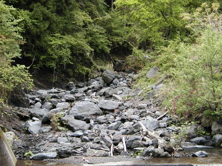手前に砂防堰堤があります。ひとりでは抱えきれないほどの大きな岩がごろごろしています。