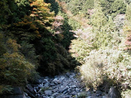 上流方面と同じく、両岸の樹木の色が見事に色づいています。