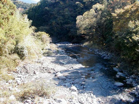 同じ地点の秋の風景です。やや、水量が減った感じですが、きれいな水が流れています。両岸の樹木も色づいています。そして、アマゴたちの産卵がうまく行きますように。