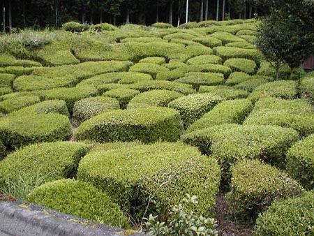 栃沢川中流付近で珍しい形の茶畑を見つけました。
