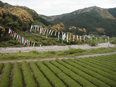 少し離れて撮影しました。お茶畑の緑と鯉のぼりの様々な色がマッチしてきれいですね。