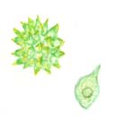 ![]() 金平糖型の集合果は、トゲトゲがひどく曲がるそう果が集まる |